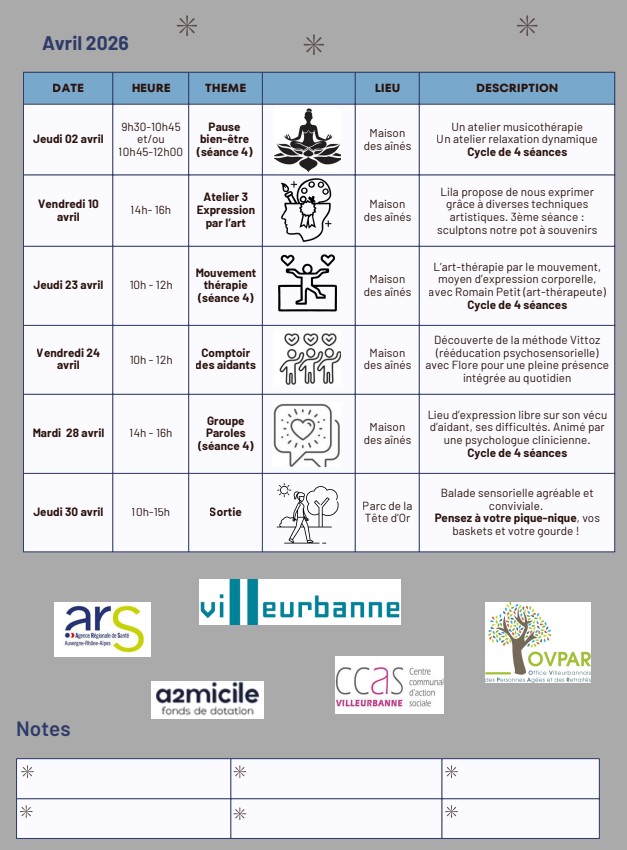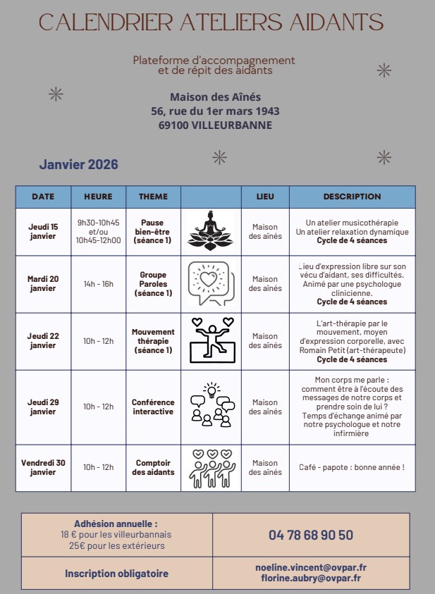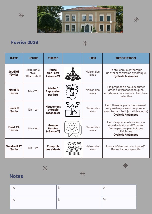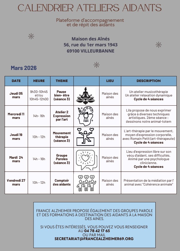 Que ce soit par des groupes de parole, des ateliers de relaxation ou de musicothérapie, ou encore tout simplement par le fait de passer un bon moment au Comptoir des aidants, n’hésitez pas à vous inscrire !
